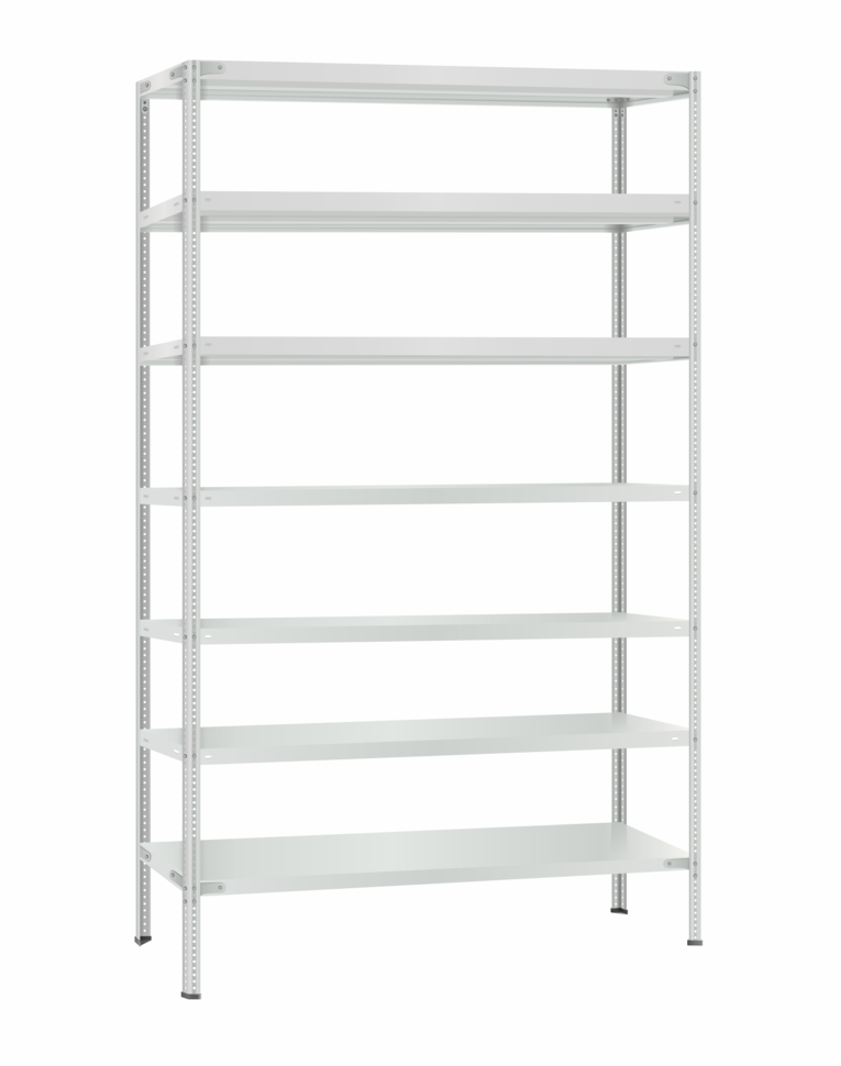 Полки МС Титан изготовлены из высокопрочной стали, покрыта полимерным порошковым покрытием светло серого цвета RAL 7035 типа шагрень